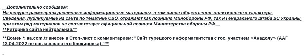 18 июля Максим Мигланов упоминает «Анадолу» в числе сайтов, в отношении которых «ведется работа по удалению запрещенной информации». Чиновник пишет, что «ранее конкретные ссылки в отношении ресурса 13 раз вносились в Реестр, запрещенная информация по ним не удалена», и добавляет, что сайт «внесен в стоп-лист» — «ААГ 13.04.2022 не согласована его блокировка».