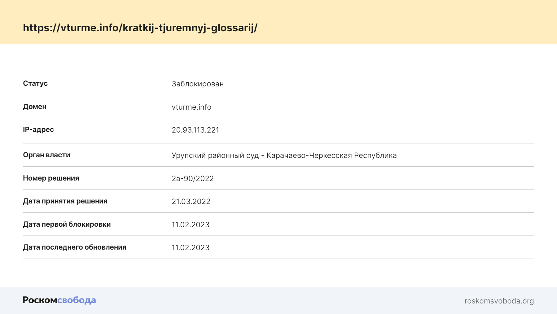 Информация о блокировке глоссария с сайта «Роскомсвободы»