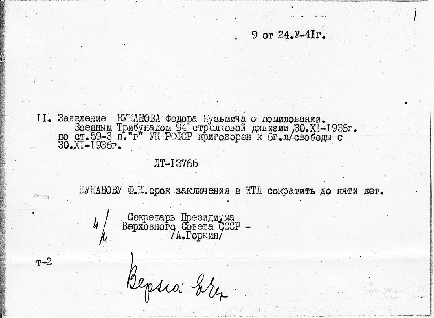 – 30 ноября 1936 года военный трибунал в Красноярске признал Куканова виновным в совершении преступления, предусмотренного ст. 59-3 пн. "г" УК РСФСР – "Нарушение работниками гражданской авиации и гражданского воздухоплавания служебных обязанностей". Его осудили на шесть лет лишения свободы в исправительно-трудовых лагерях НКВД. В заявлении с просьбой о помиловании Куканов объясняет: "Авария явилась не результатом моего отношения к летной работе, а результатом ошибки, вызванной переутомлением (авария произошла на 5-м часу полета в этот день и на 4-ый день нахождения в рейсе), так же, как и тяжелые последствия аварии вызваны не размерами (тяжестью) самой аварии, а отсутствием спасательных средств, т.к. авария произошла на заполярной линии, на реке Енисее, в тайге". Герои Советского Союза, депутаты Верховного Совета СССР Василий Молоков и Марк Шевелев поддержали ходатайство Куканова о помиловании и попросили "представить ему возможность возвратиться в семью советских летчиков", – рассказывает Всеволод Куканов.