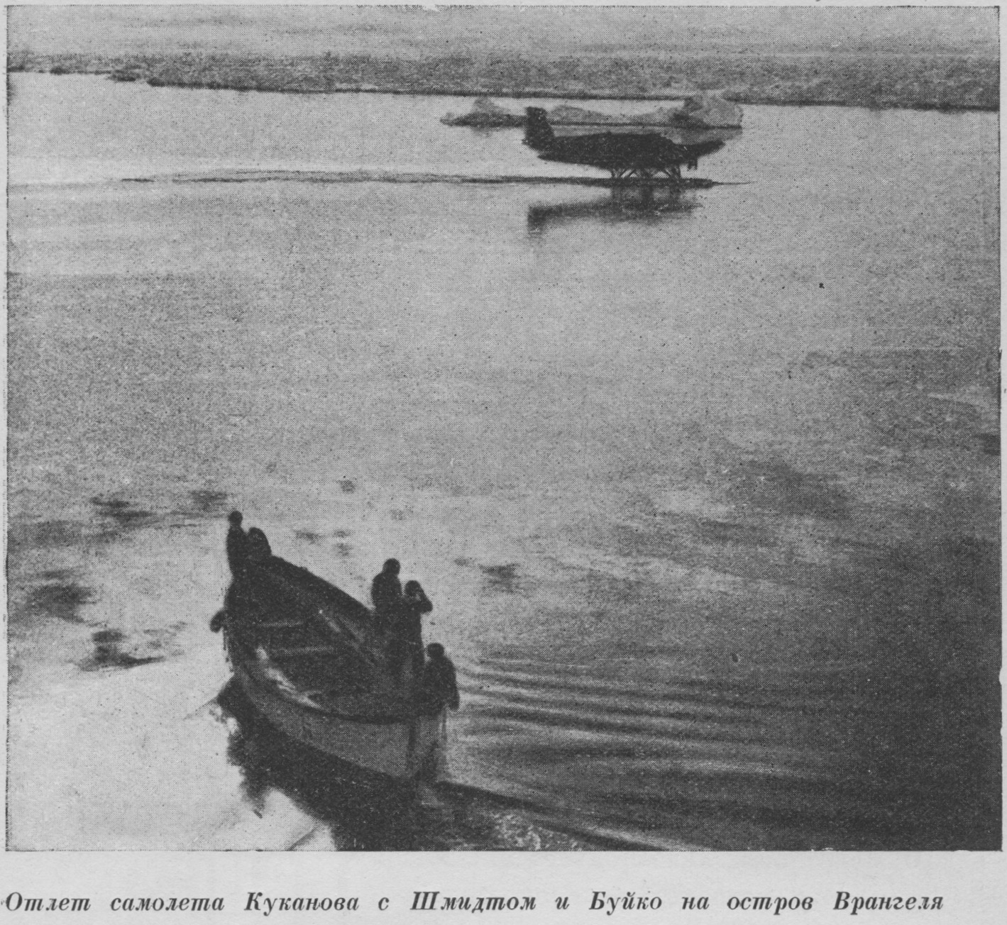 Самолет медленно разворачивается и на полном газу снова бежит в другой конец разводья. Опять неудача. Снова разворот и снова разбег – и так несколько раз. Полный состав команды и три пассажира не под силу старому, давно уже отлетавшему свои часы самолету. Только через полтора часа, высадив в шлюпку Копусова и откачав из поплавков набравшуюся туда воду, самолет Куканова оторвался от воды и, набрав высоту, взял курс на остров Врангеля".