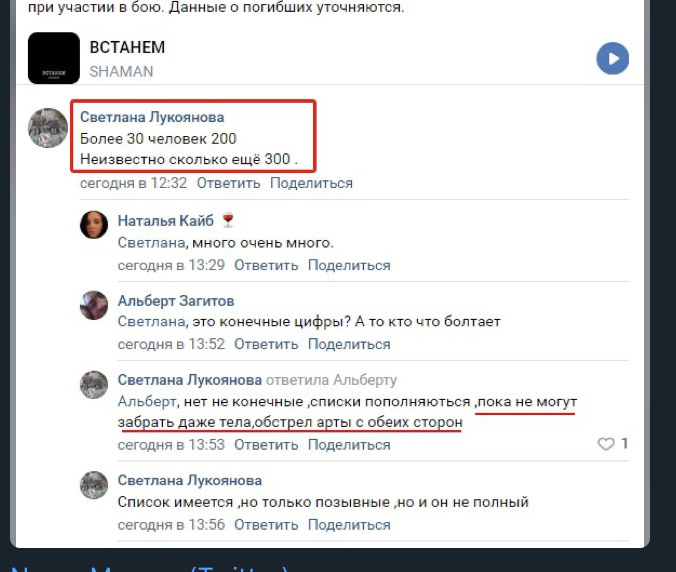 В тот же день в другом паблике — "АЛГА БАТАЛЬОН" — одна из пользовательниц в комментариях заявила, что число погибших — 30, при этом неизвестно, сколько военных ранено. Позже этот комментарий был удалён. Те же оценки публикует и украинское СМИ "Телеграф", впрочем, ссылаясь на всё те же соцсети россиян.