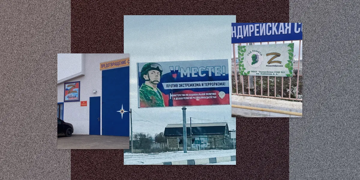Военная символика бросается в глаза лишь на юге Дагестана, в Дербенте: магазины, автомобили, стеклянные витрины кафе украшены стикерами с Z. Более основательные щиты установлены на центральной площади и автобусных остановках.