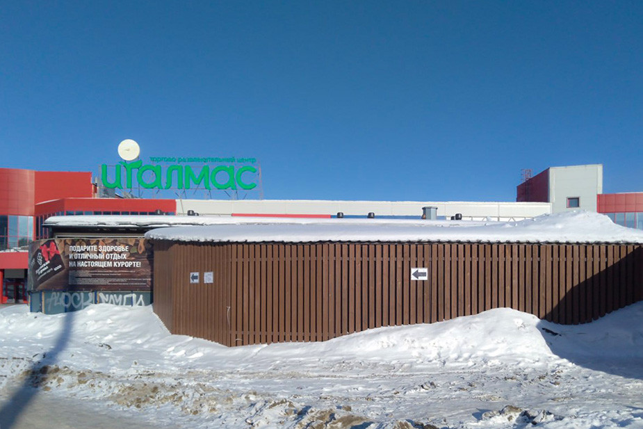 «Ижевские термы» расположены в ТРЦ «Италмас» — трехэтажном торговом комплексе в самом густонаселенном районе Ижевска. Он открылся в 2015 году и с тех пор никогда не пустовал, даже после ухода из РФ иностранных брендов. Кроме оздоровительного комплекса, помещения в нем арендовали рестораны и кафе, магазины техники, одежды, косметики, продуктов.