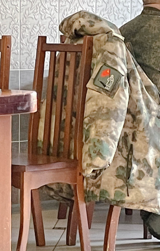 Кафе заполняется. От некоторых столов поднимается запах вина и водки вперемешку с кисловатым запахом столовой. На вид всем посетителям около сорока лет, на лица некоторых из них жутко смотреть: измождённые, заплывшие и опухшие, с подбитыми висками и следами запёкшихся гноя и крови, со стеклянным взглядом. У них разные шевроны. У кого-то — «Z» в цветах триколора, у кого-то — бабушка с советским флагом, у некоторых — просто флаг РФ или символ подразделения. Они шумят. Они пьяны и озлоблены: