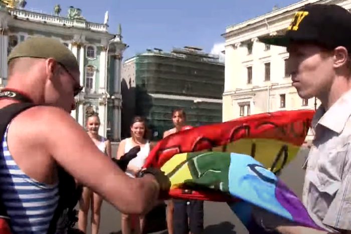 Одно из самых популярных видео на канале длится чуть больше минуты. Саша сняла ЛГБТ-активиста Кирилла Калугина, который в 2014 году вышел в одиночный пикет на Дворцовую площадь в День ВДВ. Человек в тельняшке и с камерой тут же отобрал у Калугина радужный флаг, а следом активиста задержали два сотрудника полиции. Это, кстати, была вторая подобная акция Калугина.