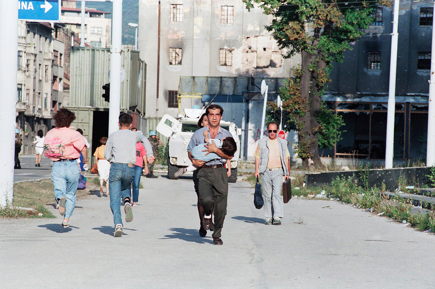 Мужчина с ребенком бежит, спасаясь от снайперского огня, Сараево, 10 сентября 1994 года. Фото: Rikard Larma / AP