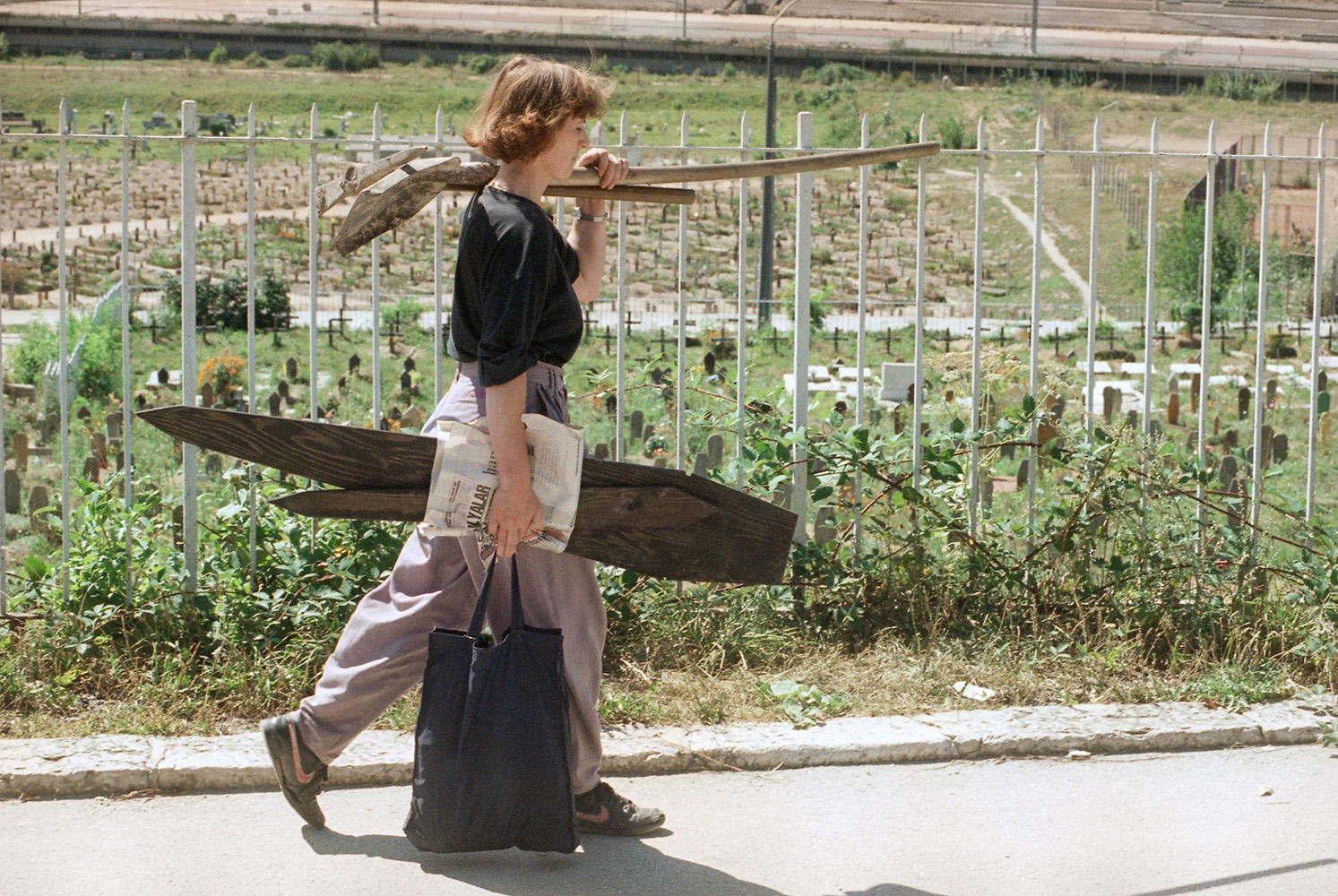 Женщина несет памятник на могилу своего брата, боснийского солдата, 1994 год. Фото: Enrich E. Marti / AP
