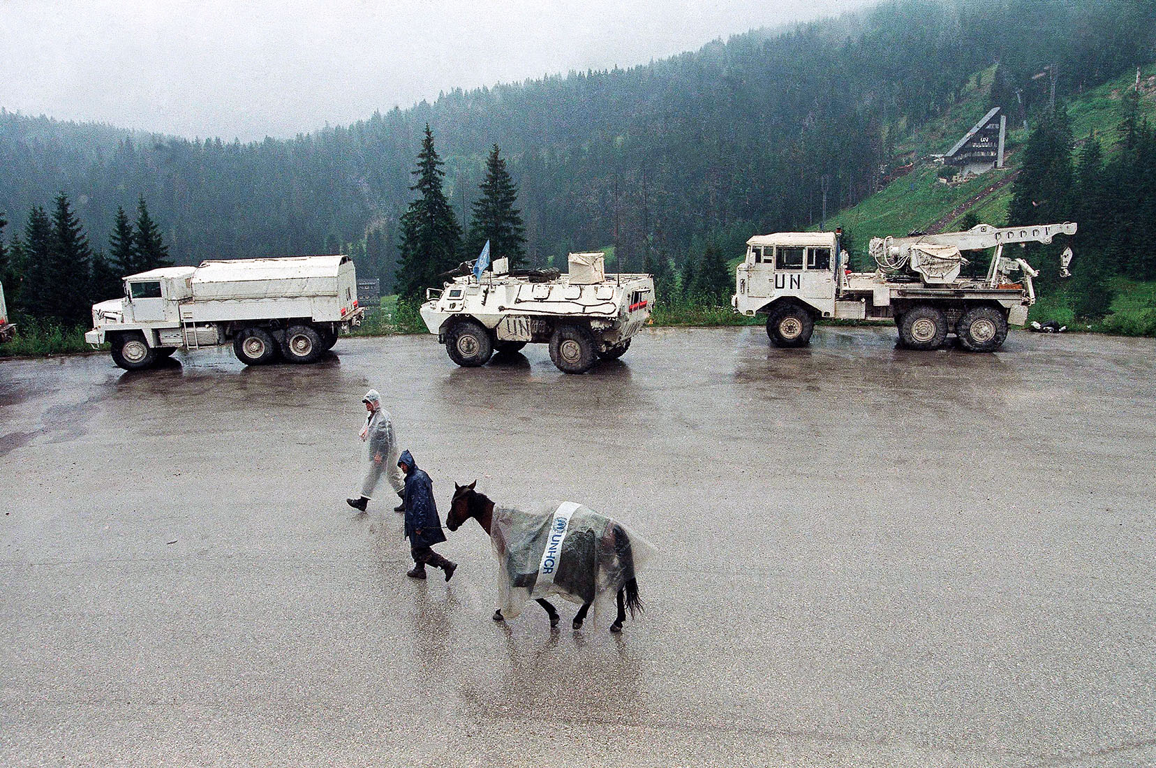 Машины ООН на горе Игман недалеко от Сараево, 30 июля 1995 года. Фото: John Moore / AP