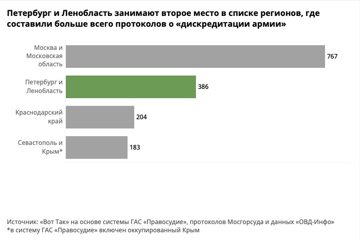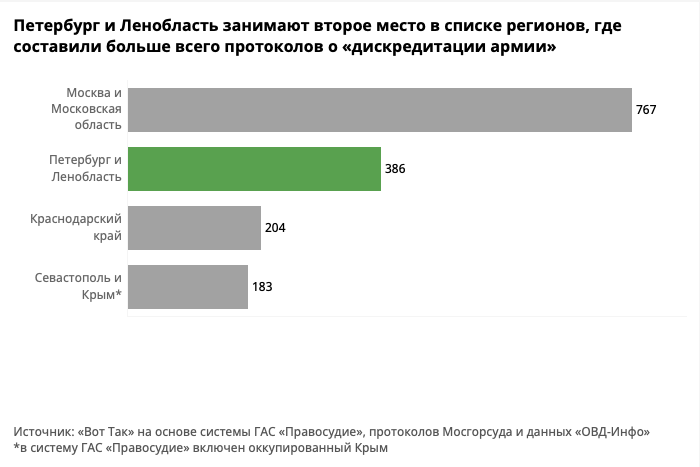 Следом за ними идут Петербург и Ленинградская область, где составили 386 протоколов. Также в список попали Краснодарский край (204 протокола) и оккупированные Севастополь и Крым (183 протокола).