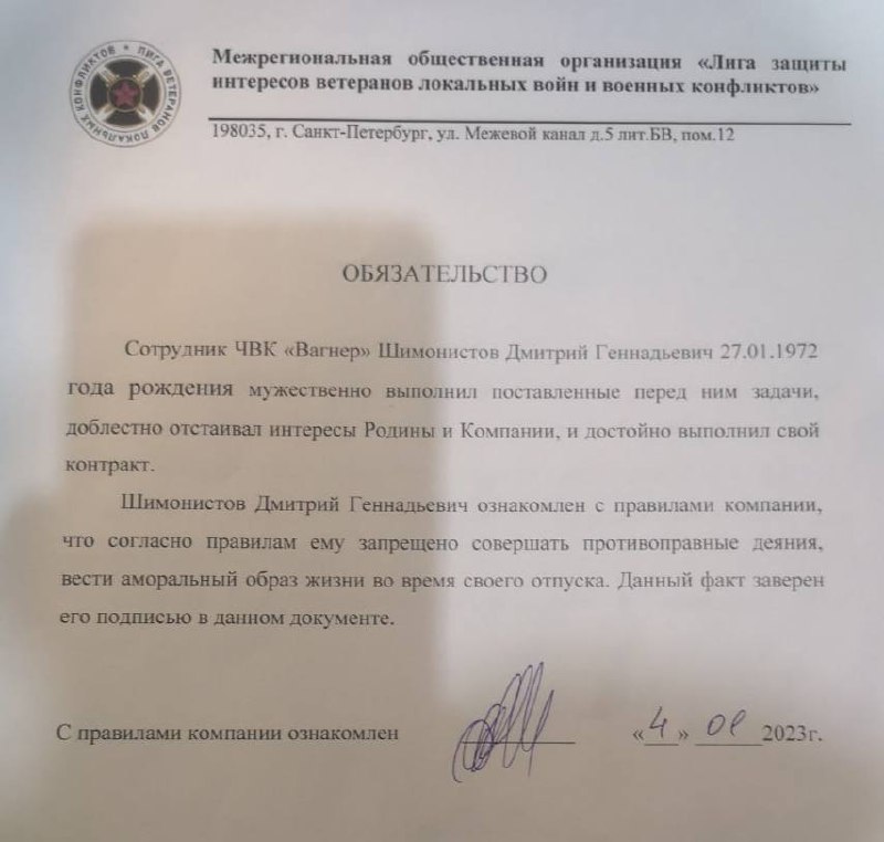 Как пишет «Ротонда», экс-боевик опубликовал подписанное им «обязательство» на бланке межрегиональной общественной организации «Лига защиты интересов ветеранов локальных войн и военных конфликтов». Там говорится, что Шимонистов «доблестно отстаивал интересы родины и компании и достойно выполнил свой контракт».