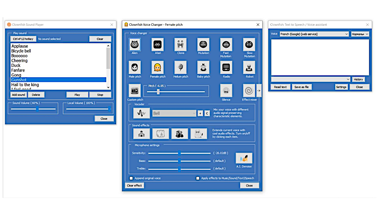 Еще одна бесплатная программа, и тоже (увы!) только для Windows. Clownfish — рыбка-клоун, знаменитый мультипликационный герой. Трудно сказать, почему программу для работы с человеческой речью назвали в честь рыбы, да еще по имени Немо. Как и предыдущая программа, Clownfish Voice Changer отдыхает в системном трее, а меню можно вызвать правым кликом мыши. Приятная неожиданность — есть интерфейс на русском языке. Правда, не все пункты меню и окошки локализованы. На день написания этой статьи была доступна версия программы 1.70.