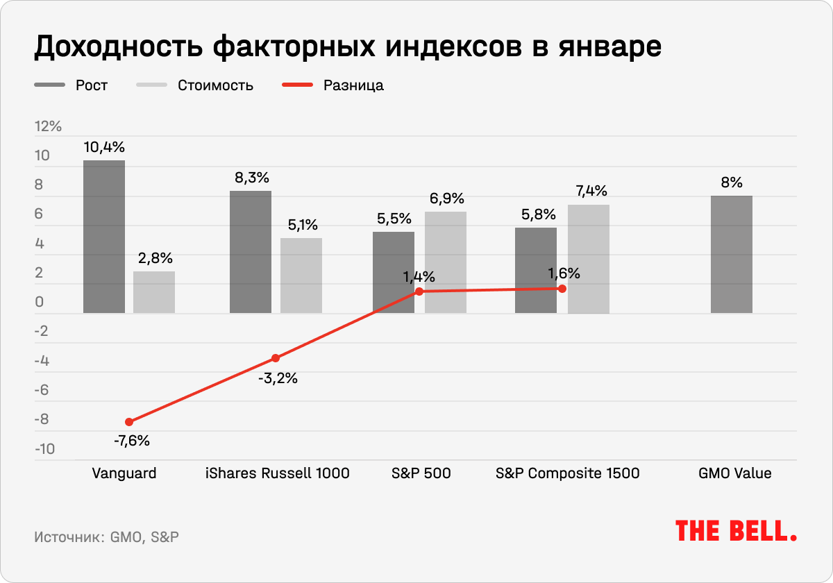 Инвесторам стоит иметь в виду, что динамика индексов, которые являются бенчмарками для американских акций стоимости и роста, сильно отличается у разных провайдеров, обращают внимание в инвесткомпании GMO Джереми Грэнтхема. К примеру, индекс акций роста Vanguard опередил в январе доходность индекса стоимости на 7,6 процентных пункта. Похожая картина у MSCI USА: доходность составила 11,2% и 3,3% соответственно.
