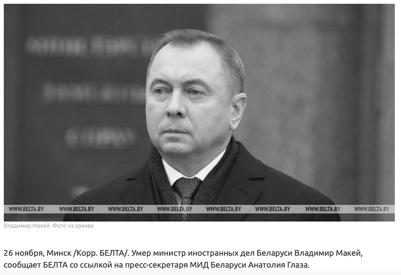 В сообщении о смерти Макея, распространенное 26 ноября агентством БелТА со ссылкой на пресс-секретаря Министерства иностранных дел Беларуси, не было ни типичной для официального стиля беларусских властей формулы "Скоропостижно скончался", ни другой типичной формулы "После продолжительной болезни умер", обращает внимание "Наша Ніва".