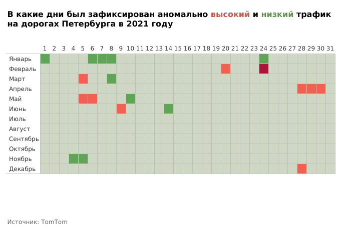 На протяжении 2021 года исследователи TomTom также регистрировали дни с аномально высокой и низкой загруженностью дорог. Согласно этим данным, наиболее свободными дороги были в Петербурге в праздничные дни, когда горожане не работали, — после Нового года, 8 Марта, в День народного единства и 10 мая, после Дня Победы.
