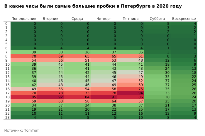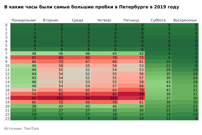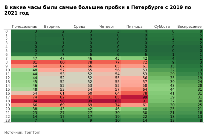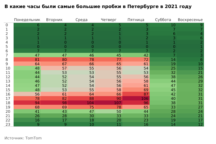 Утренние часы пик в Петербурге приходятся на 8:00 (поездка занимает на 77 % больше времени) и 9:00 (на 64 %). Самые большие пробки возникают в 17 (поездка занимает на 81 % больше времени), 18 (на 94 %) и 19 часов (на 66 %).