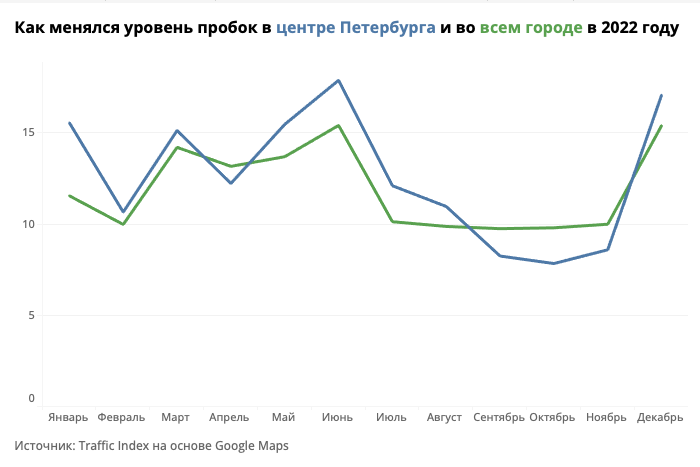При этом в 2022-м дороги в Петербурге были сильно загружены не только в декабре, но и в июне — уровень пробок в городе тогда составил 15,4 %, посчитала «Бумага» на основе данных Traffic Index.