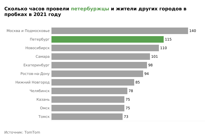 По данным TomTom, в 2021-м петербуржцы провели в пробках примерно 115 часов. В среднем петербургские водители тратят на 50 % больше времени, чем необходимо для поездки по пустой дороге, следует из результатов исследования компании.