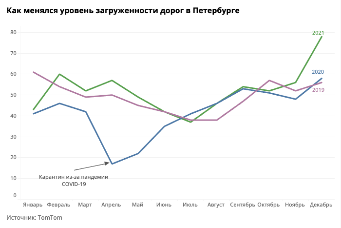 По данным TomTom, самые большие пробки в Петербурге возникли накануне Нового года в декабре 2021-го. В среднем за месяц водители тратили на дорогу на 78 % больше времени. Для сравнения: за аналогичный период прошлых лет процент лишнего времени, потраченного петербургскими водителями на поездки, составлял 58 в 2020-м и 56 в 2019-м.