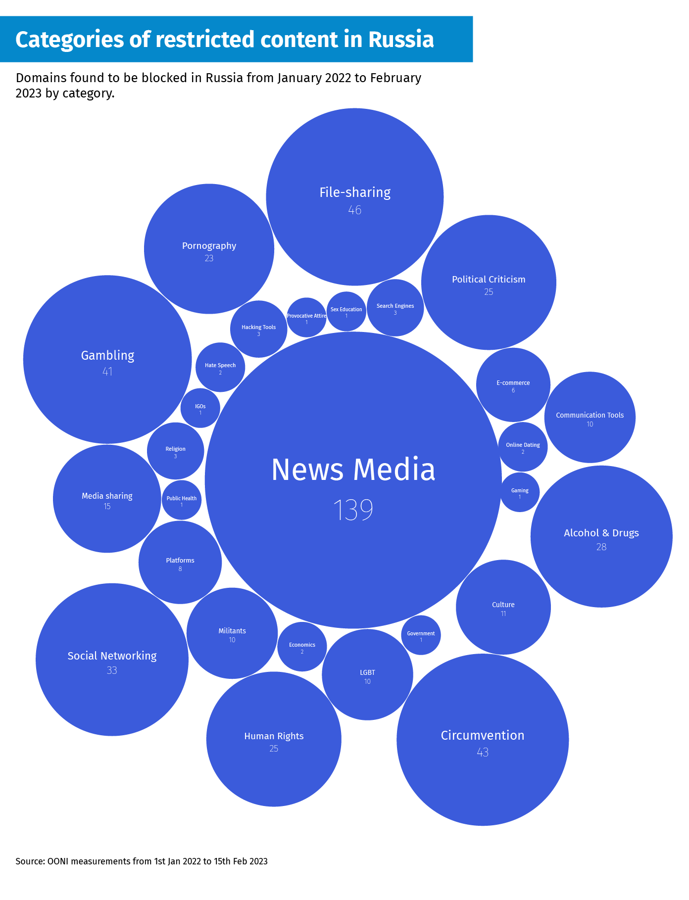 За последний год прошла серия новых блокировок: анализ OONI показывает блокировку 494 доменов, подпадающих под 28 категорий контента, что свидетельствует о повсеместной интернет-цензуре в России. Многие из этих блокировок относятся именно к военной цензуре.
