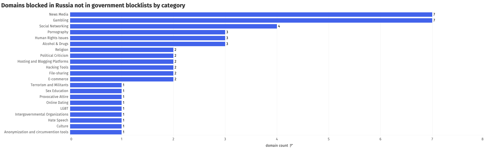 Сравнивая данные о 494 подтверждённых заблокированных доменах с официальными решениями о блокировках за последний год, в OONI обнаружили, что подавляющее большинство заблокированных доменов действительно были внесены в реестр Роскомнадзора. Однако 48 доменов в нём нет. Это говорит о том, что некоторые интернет-провайдеры в России могут блокировать не только сервисы, указанные в реестре, но также и другие домены, используемые этими сервисами. Ниже приведена статистика по таким доменам. Первые три строчки занимают ресурсы следующих категорий контента: СМИ, азартные игры и социальные сети.