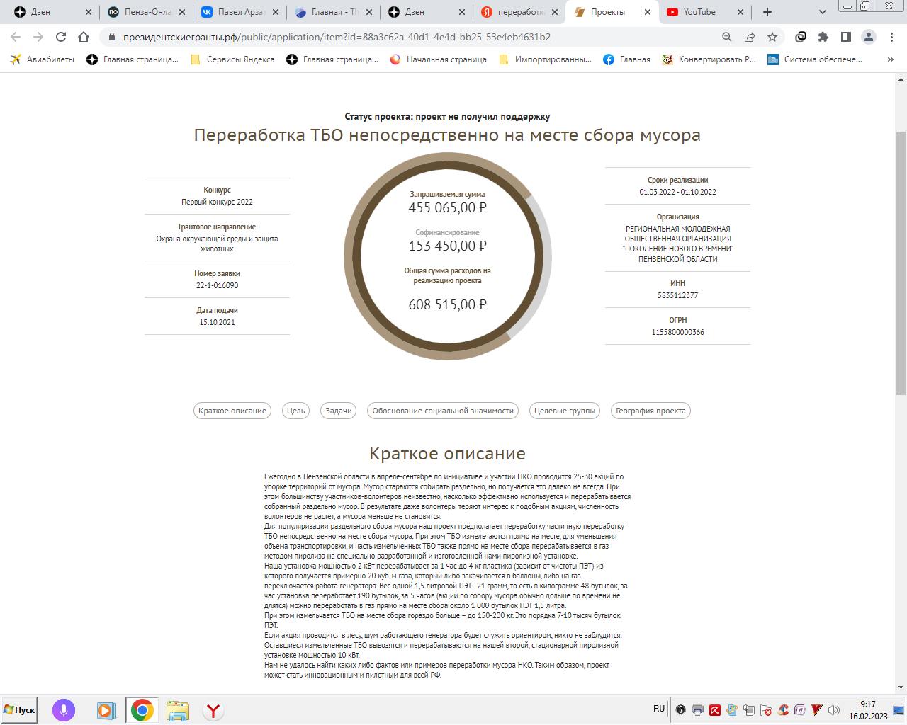 Снова подаем заявку на проект «Переработка ТБО непосредственно на месте сбора мусора», на этот раз от НКО «Экология против онкологии».
