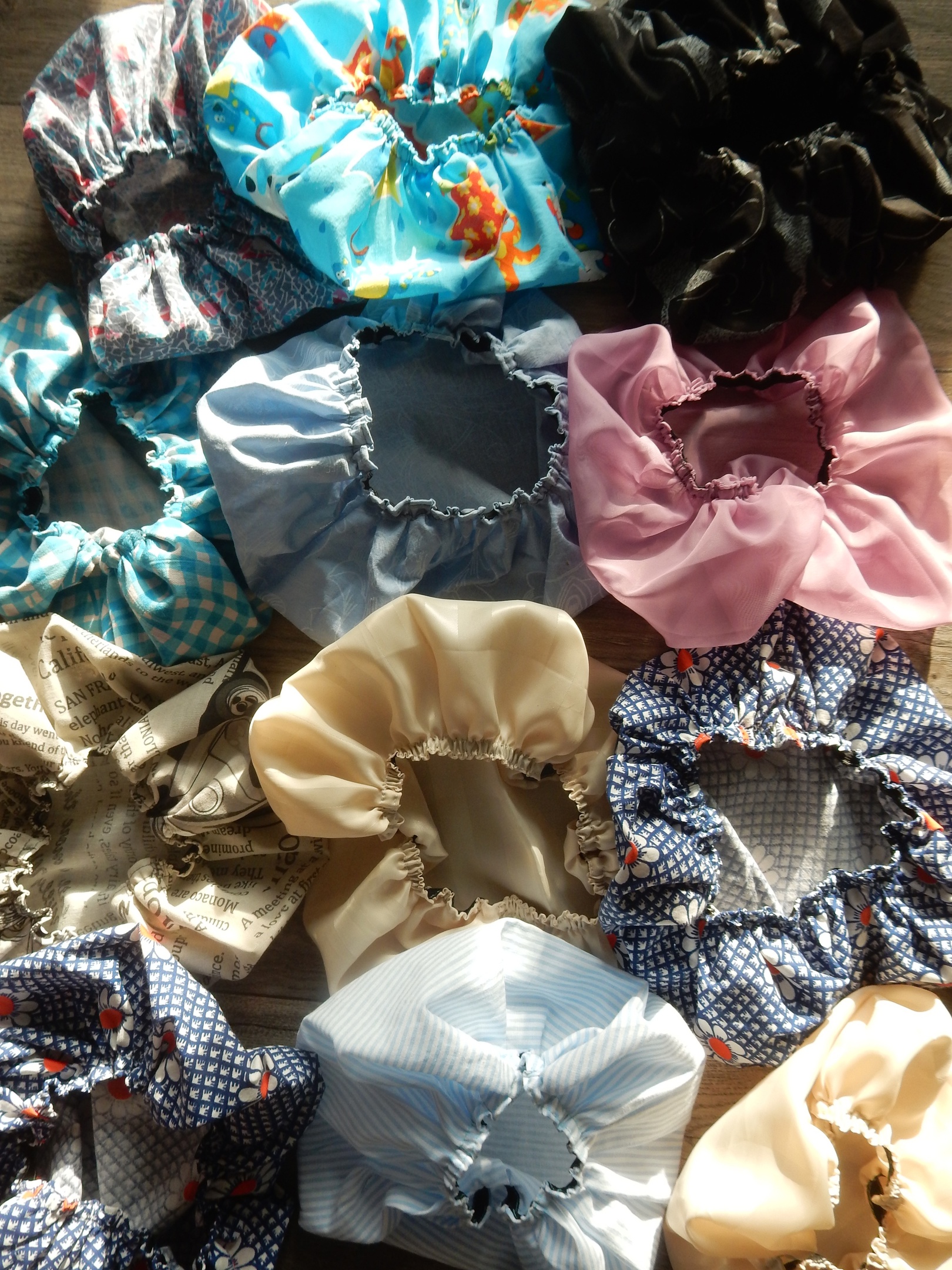 Я специально выбрала поярче расцветки тканей для будущих фото — теперь наши экоуроки станут еще более ЭКО! А если кому-то интересно — то вот вам мой лайфхак. Берете квадрат или круг ткани диаметром 50 см, нужна мягкая резинка 10 мм (белая или черная) и нитки. Я сначала прострачиваю защипы по периметру 1-1,5 см, чтобы стянуть края, а потом настрачиваю резинку, подгибая край внутрь. Причем здесь надо растягивать резинку, а потом в таком положении шить. Я думаю, что швеи это и так знают)