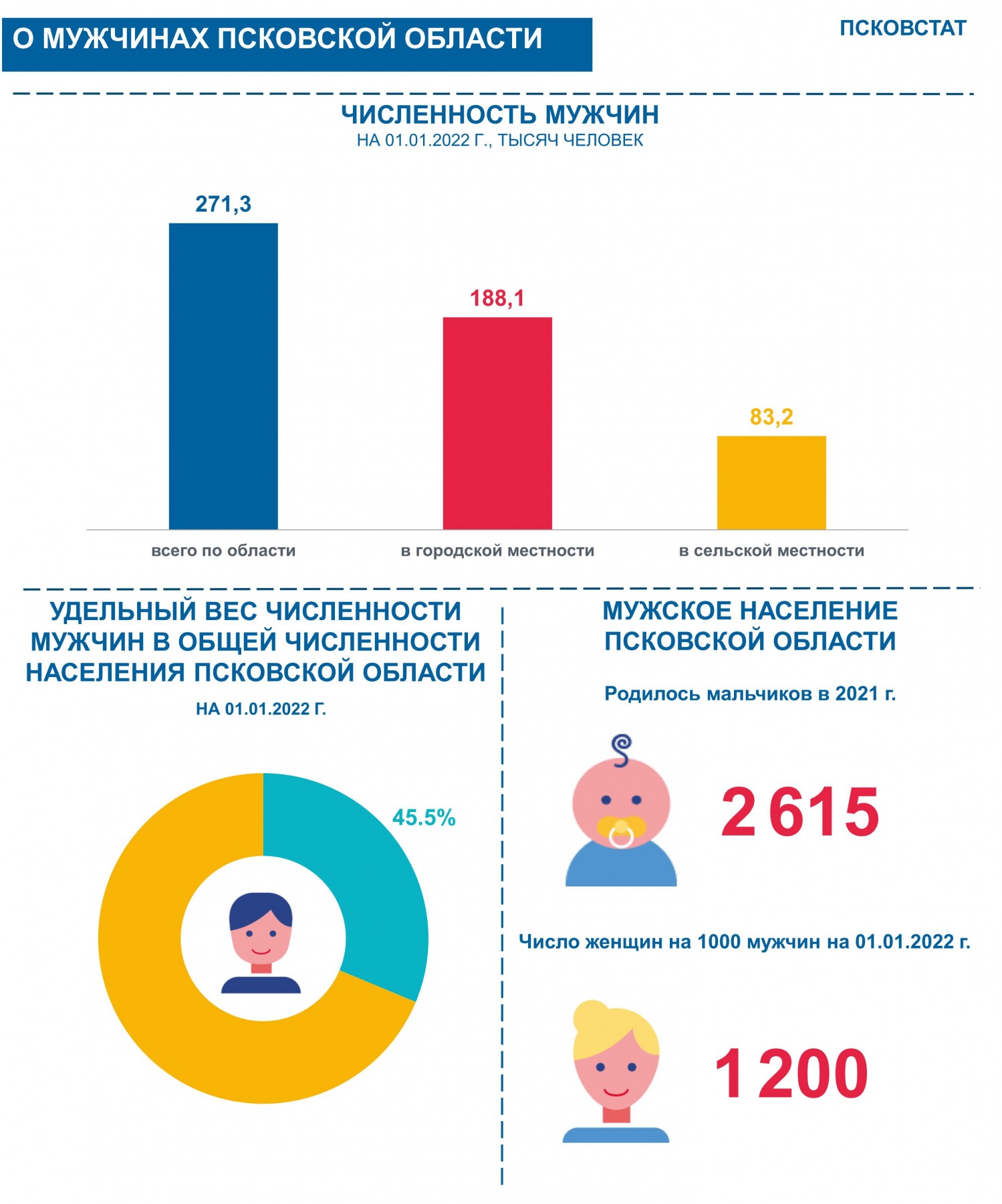 На 1000 мужчин в Псковской области приходится 1200 женщин: по данным Псковстата, на 1 января 2022 года в Псковской области проживало 271,3 тысячи мужчин или 45,5 процентов от общей численности населения области (с учётом итогов Всероссийской переписи населения 2020 года). Превышение численности женщин над численностью мужчин в области наблюдается после 42 лет.