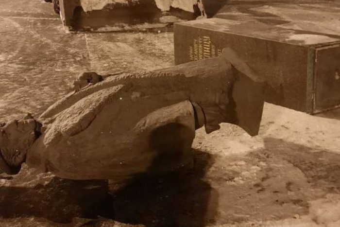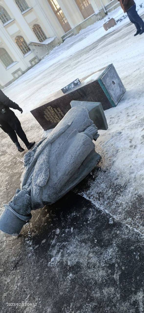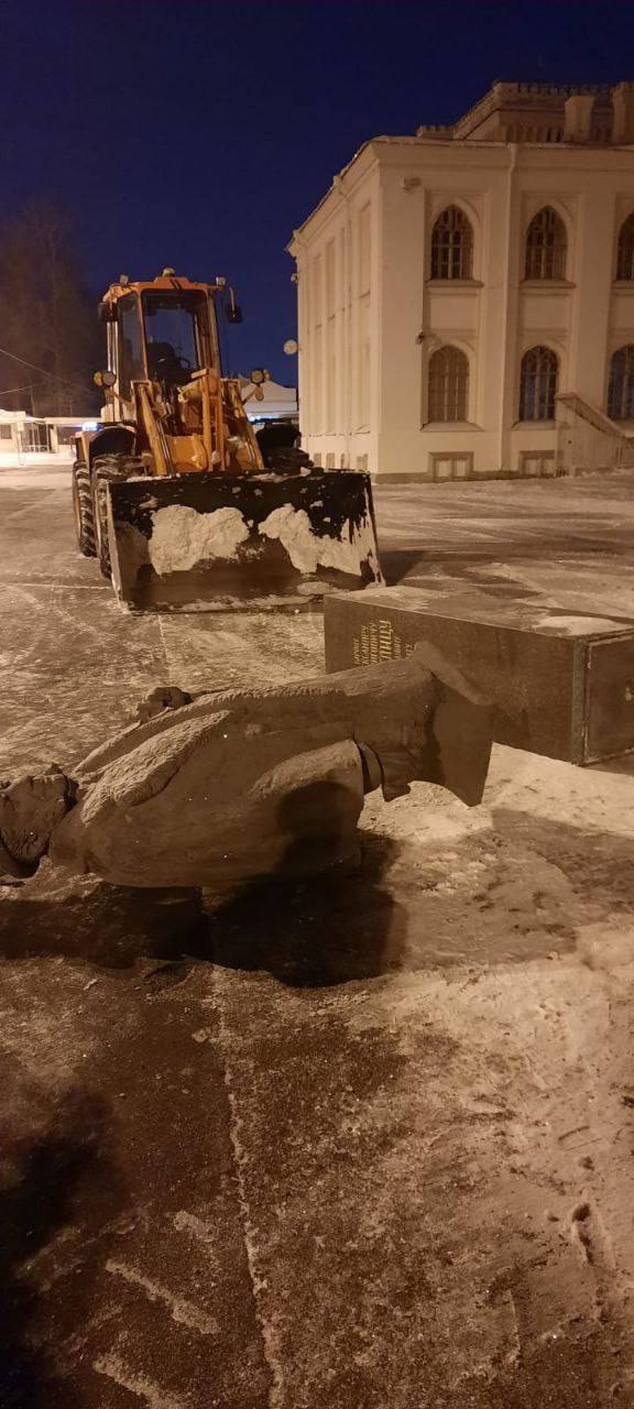 Детали. На видео видно, что водитель снегоуборочной машины сдавал назад и случайно врезался в постамент, который упал вместе с памятником на землю.