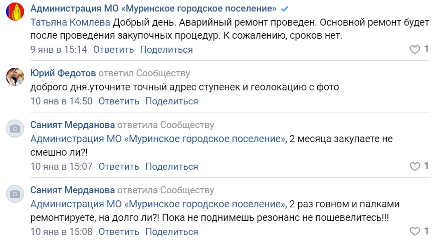 9 января под этим же постом появился комментарий администрации Мурина: «Аварийный ремонт проведен. Основной ремонт будет после проведения закупочных процедур. К сожалению, сроков нет». В ответ пользователи написали, что уже второй раз ремонт проводят «говном и палками».