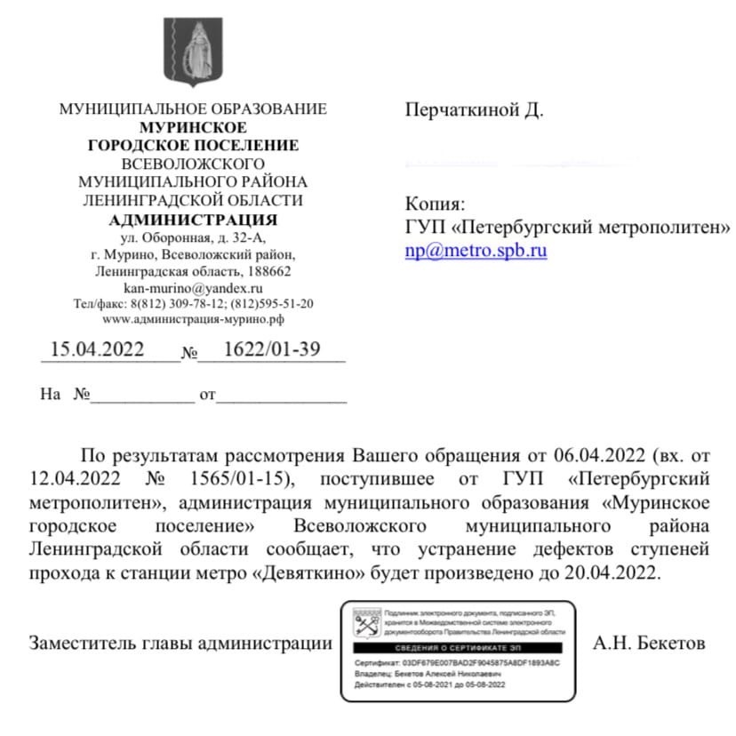 Другая участница группы написала, что направляла просьбу устранить повреждения на лестнице еще 15 апреля 2022 года. Женщина обращалась в петербургский метрополитен, откуда ее письмо передали в администрацию Мурина. Там отвечали, что починят ступени до 20 апреля.