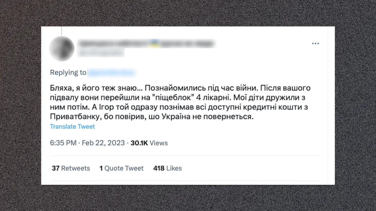 Мужчина поделился в «Твиттере», что узнал Костю из Мариуполя. Ему ответила девушка, которая также во время войны познакомилась с семьей Ващишиных: «После вашего подвала они перешли в пищеблок 4-й больницы. Мои дети дружили с ним потом. А Игорь тот сразу снял все доступные кредитные средства из Приватбанка, потому что поверил, что Украина не вернется. А после активных обстрелов я только с их семьей и общалась... Они не казались мне такими ватными, как все остальные соседи или знакомые».