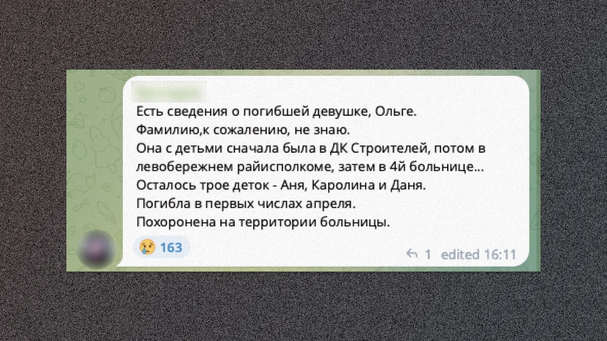 Ольга погибла в первых числах апреля — она, как утверждают очевидцы, «выбежала за сигаретами», и ее убило осколками недалеко от 4-й больницы. Ее похоронили прямо на территории больницы. Это подтверждается сообщением в телегам-канале о погибших в Мариуполе от 16 апреля.