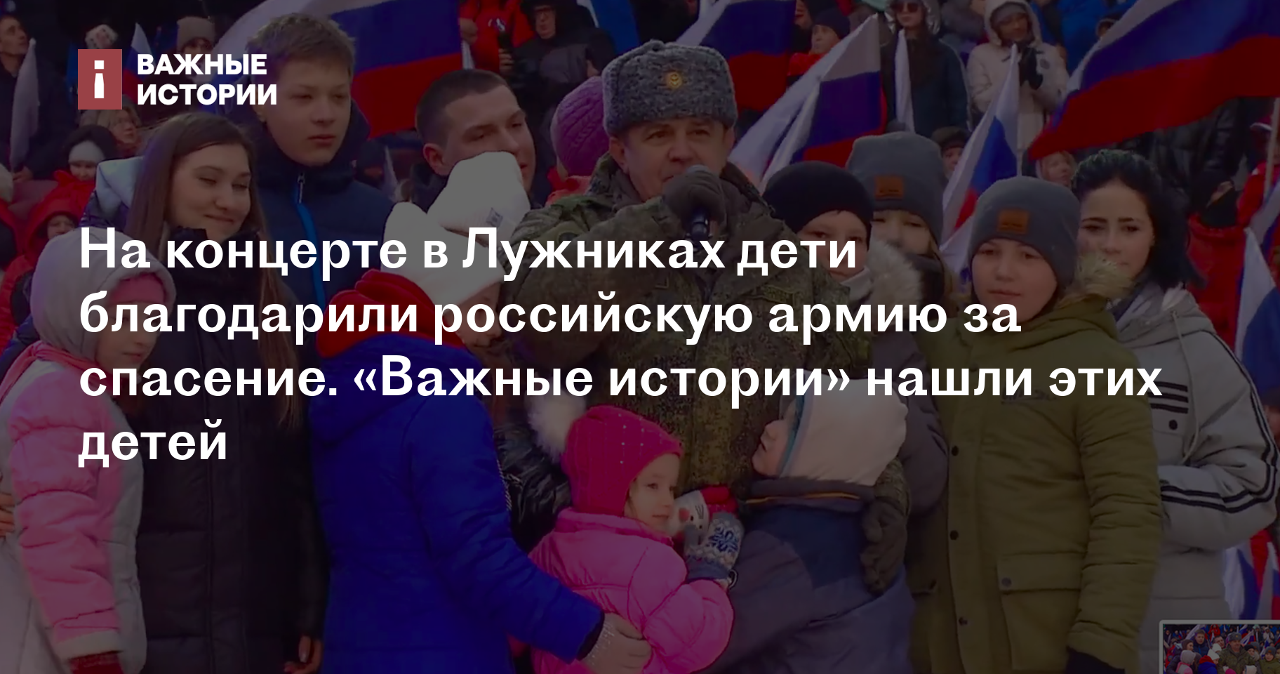 На концерте в Лужниках дети благодарили российскую армию за спасение. «Важные истории» нашли этих детей