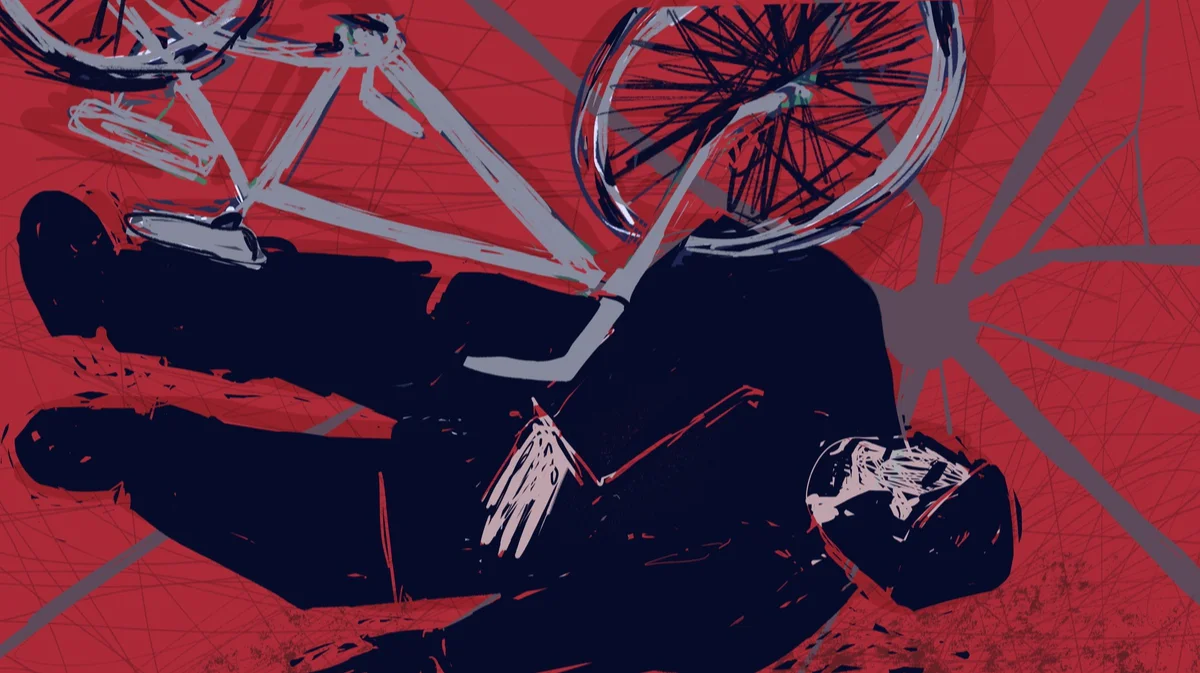 A cyclist wearing orange threaded gloves, the kind used by construction workers, lies on his back on the roadway of Yablunska street. Next to him we see a fence with brick pillars, a sign with “Townhouses” written on it (property in Bucha has always been in demand), a shell crater filled with water, and burnt fragments of something. In the distance, we see several male figures leaving the scene, also with bicycles — the main local transport during the occupation... Many cyclists were killed in those days.