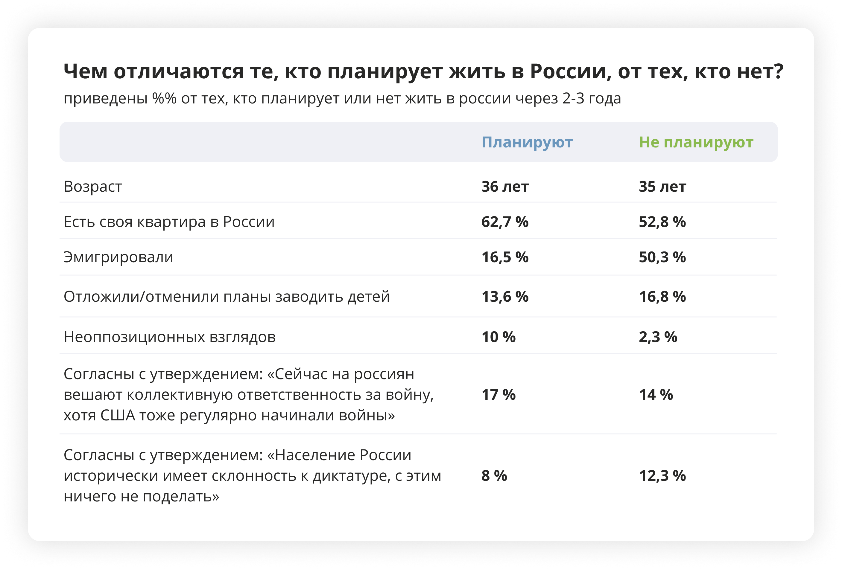 При этом прослеживается и другая закономерность: тем, кто связывает ближайшее будущее с Россией, менее близки оппозиционные взгляды. В среднем среди всех ответивших 93 % согласились с утверждением «Я против политики нынешнего руководства России». Но среди планирующих жить в стране больше тех, кто согласился с утверждениями «Меня устраивает политическая ситуация в России», «До 24 февраля 2022-го меня в целом меня устраивала политическая ситуация в России», «Я скорее против политики нынешнего руководства России, но считаю, что Путину нет лучшей альтернативы» и «Я не интересуюсь политикой».