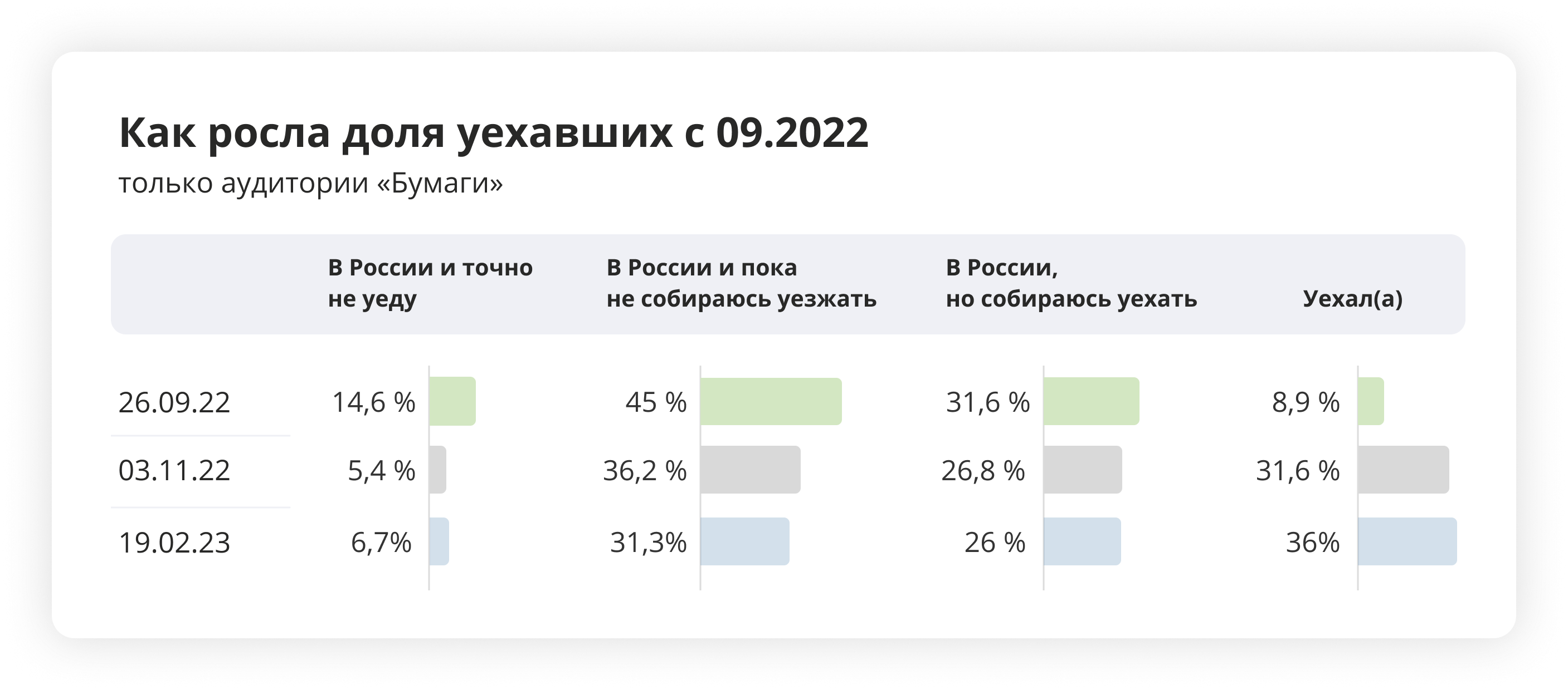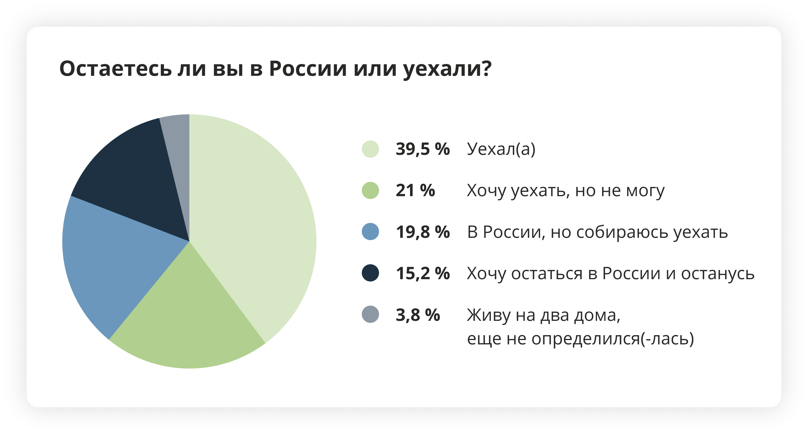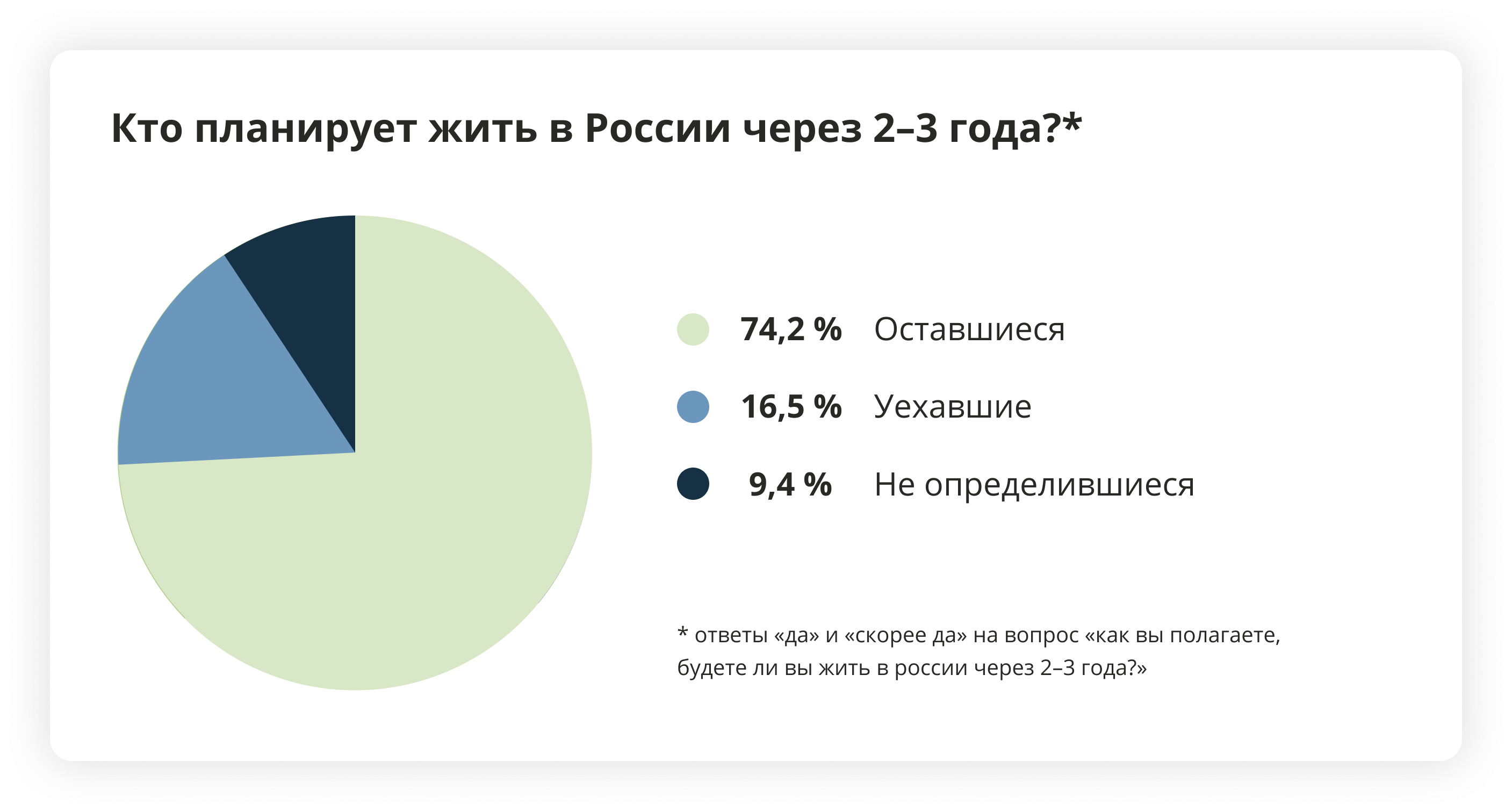 — Глядя на результаты опроса читателей «Бумаги» и других независимых СМИ, мы, разумеется, не можем делать выводов относительно всех уехавших и всего населения России. Однако это очень важные данные, которые нам говорят о настроениях и планах хорошо образованной и оппозиционно настроенной публики. Эти данные показывают нам очень важные нюансы в настроениях оставшихся и уехавших.