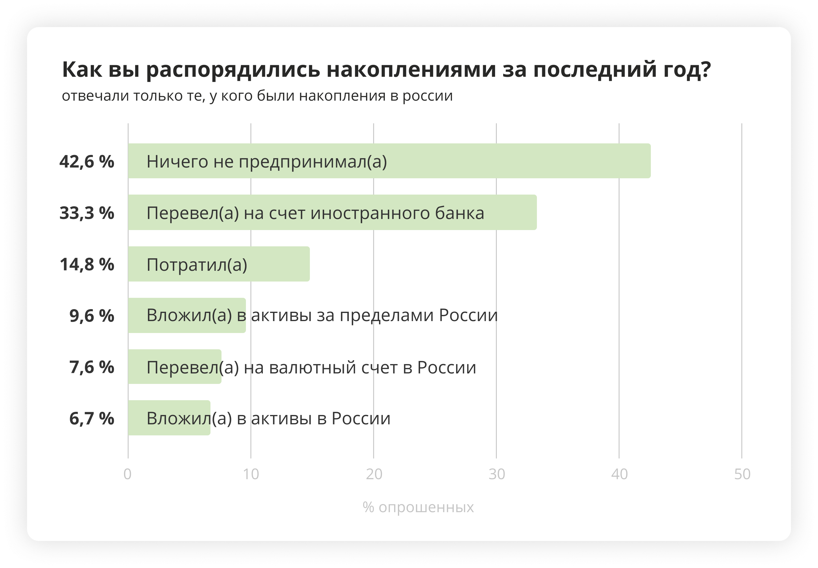 О наличии накоплений рассказали 57 % ответивших. Из них каждый третий перевел деньги на счет иностранного банка, каждый десятый — вложил в недвижимость или другие активы за границей. В российские активы деньги вложили 7 % тех читателей, у кого они были. Из этих людей, инвестировавших в Россию, только две трети собираются жить в ней через 2–3 года.