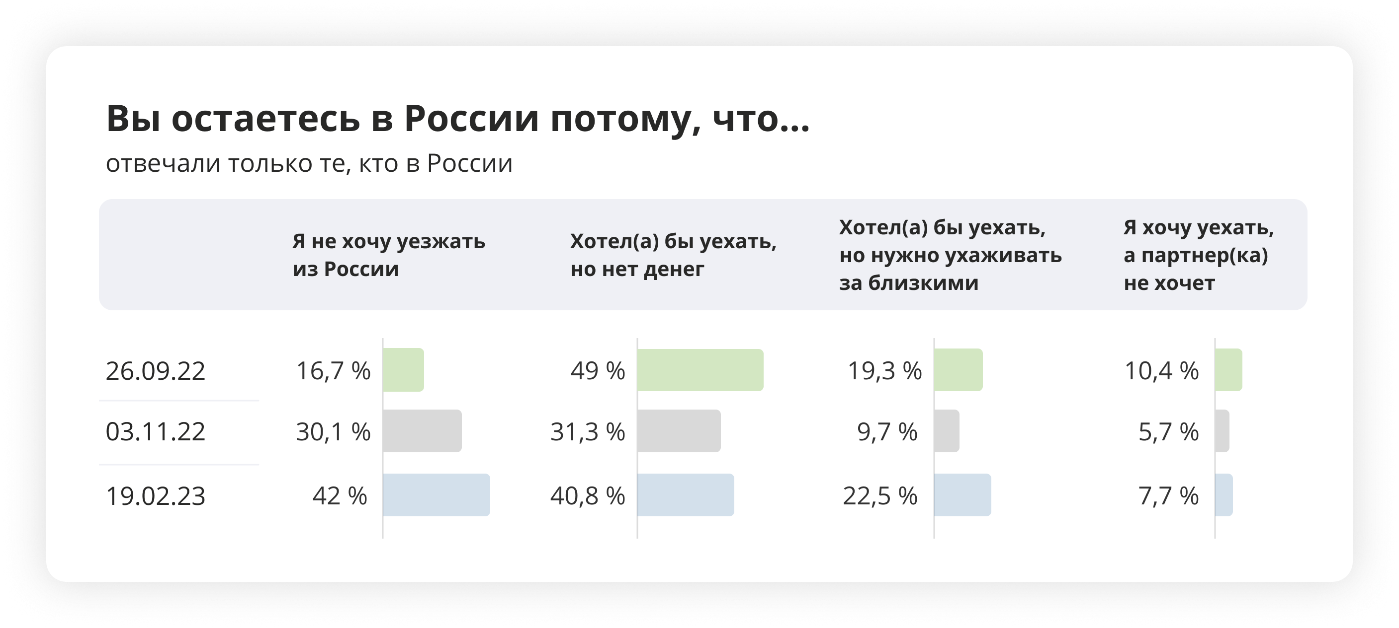 Внушительная часть (42 %) ответили, что сами не хотят уезжать. Причем в последние месяцы таких людей среди оставшихся стало больше. Вероятно, часть тех, кто раньше хотел уехать, но не мог, все-таки нашли такую возможность, и теперь в России остаются в большей степени те, кто сам этого хочет.
