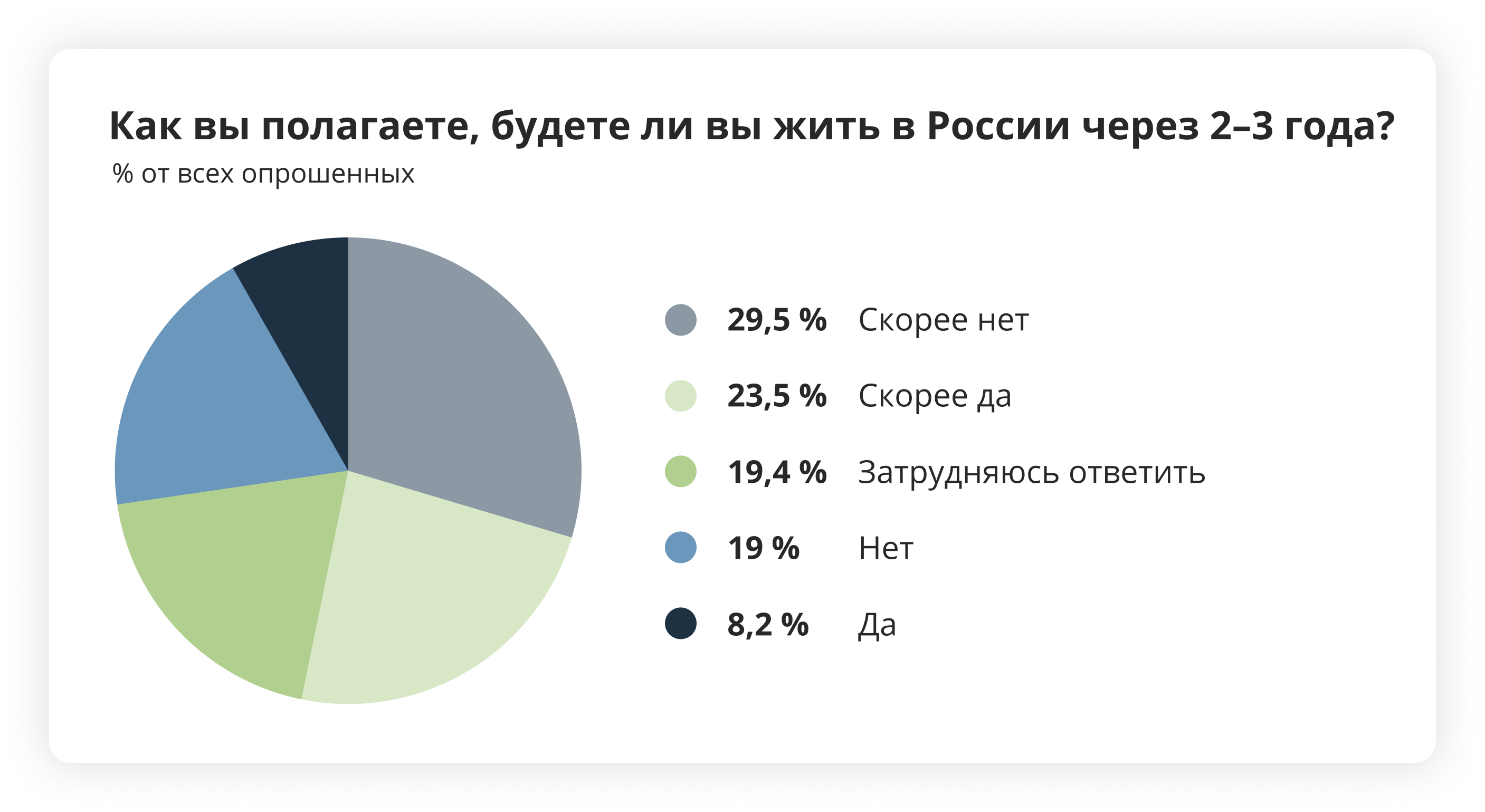 Через 2–3 года жить в России планируют меньше читателей: 32 % (а какая-либо уверенность в этом есть только у 8,2 %).