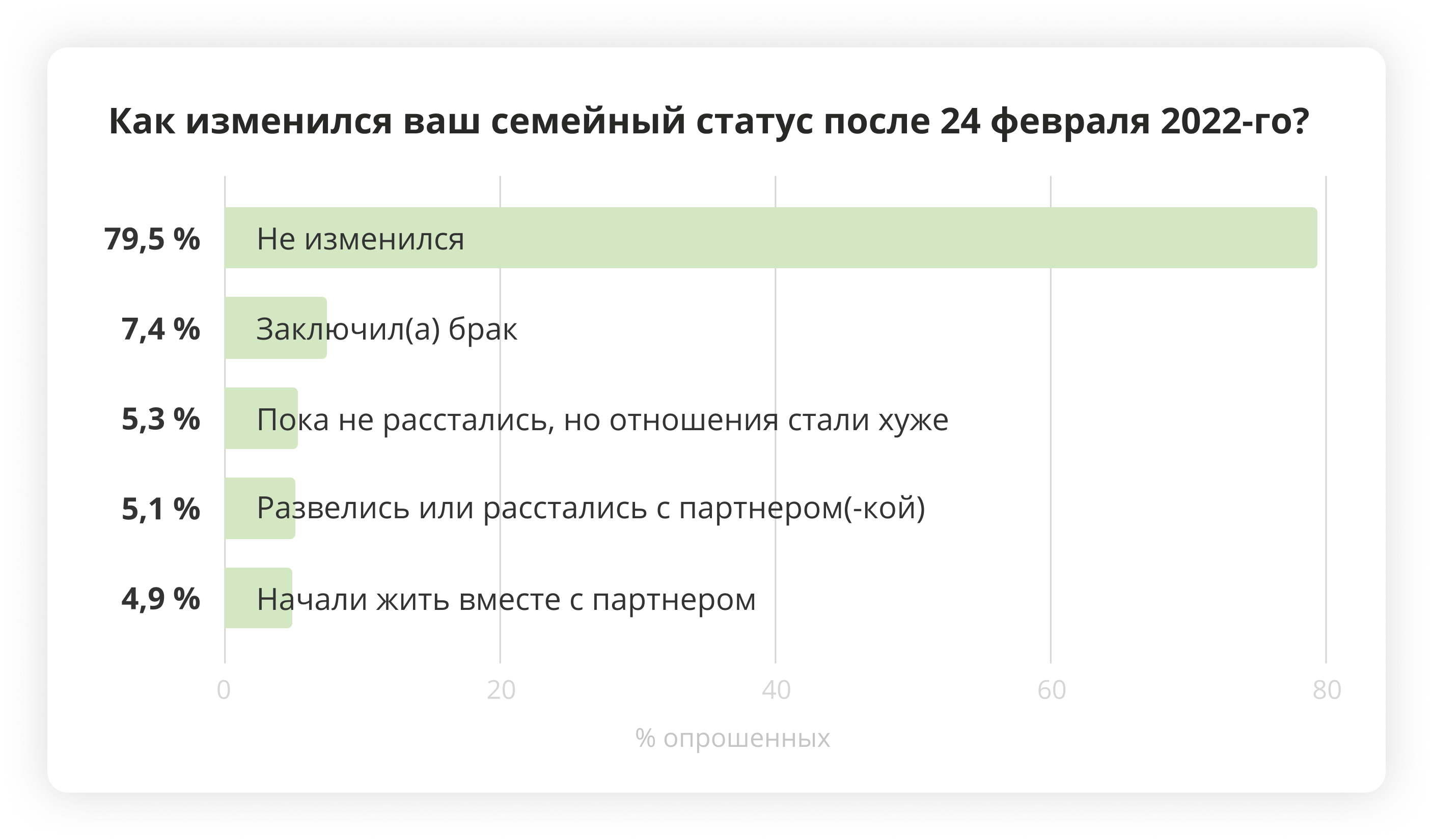 Год войны стал серьезным испытанием для отношений в парах. На фоне выросшего числа браков среди эмигрантов, каждый десятый читатель ответил, что отношения с партнером стали хуже или развалились.