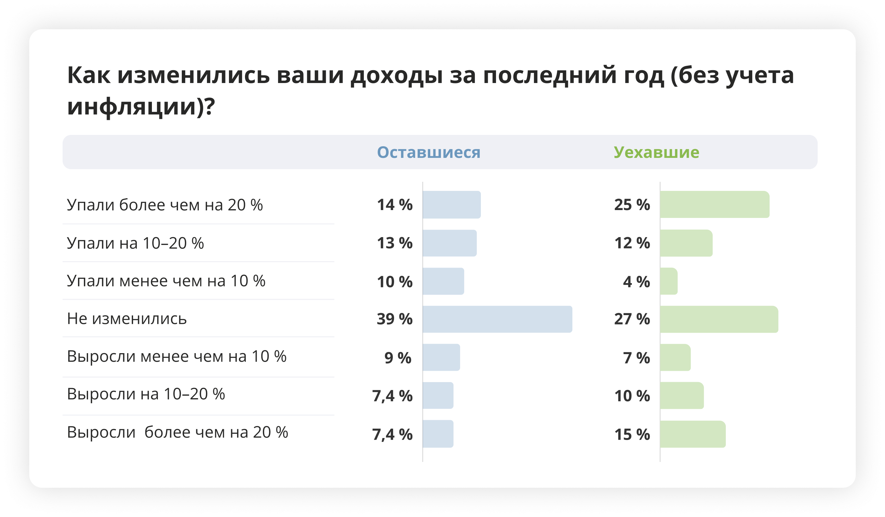 При этом уехавшие даже больше уверены в том, что останутся на своей работе еще минимум год — так думают 26 % эмигрантов и 21 % остающихся. То есть риски потери работы или бизнеса в России в 2023 году респонденты оценивают как очень высокие.