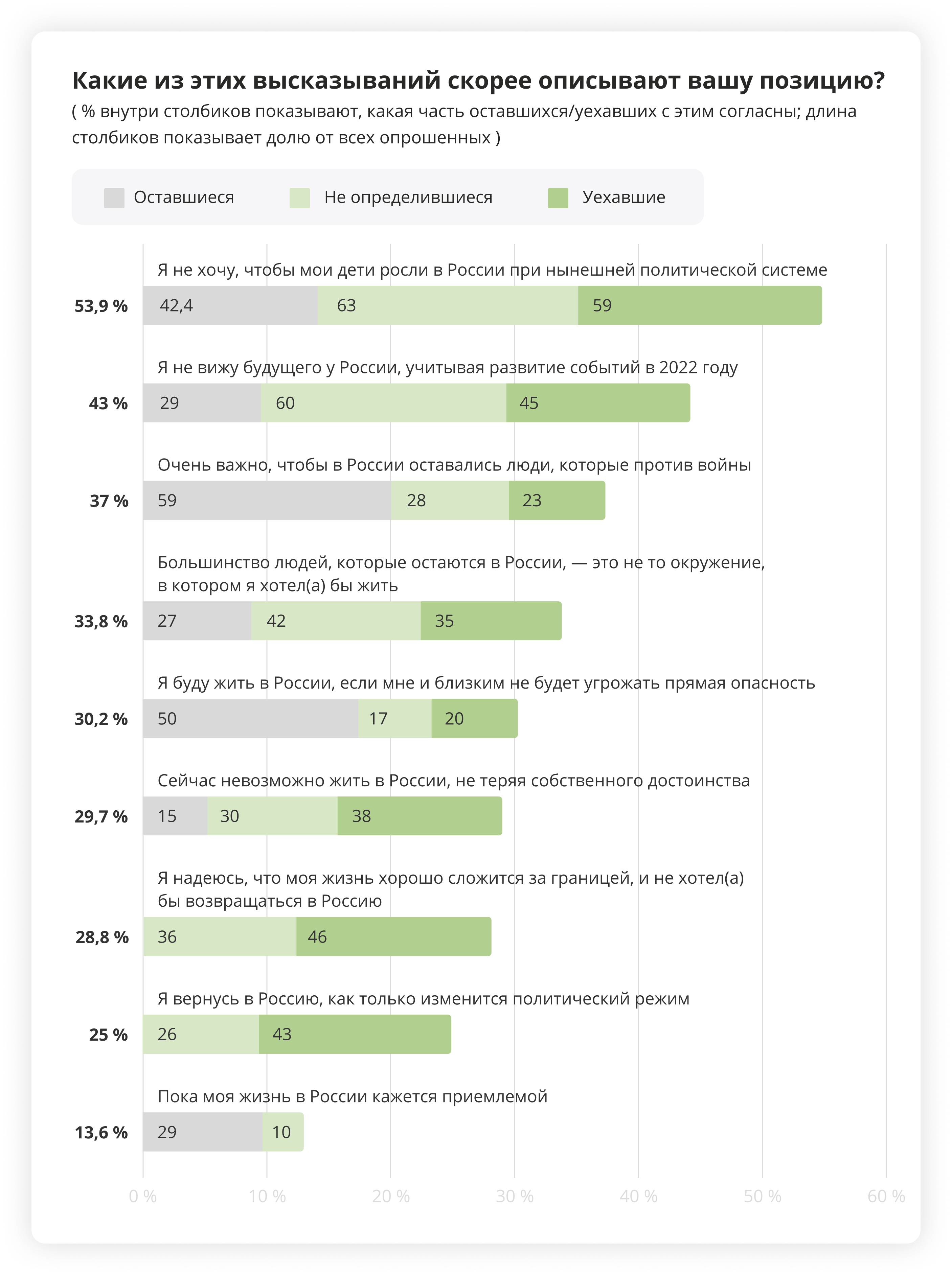 15 % из остающихся согласились, что сейчас невозможно жить в России, не теряя собственного достоинства. А из тех, кто ранее ответил, что остался в России по своей воле, это высказывание выбрали 7 %.