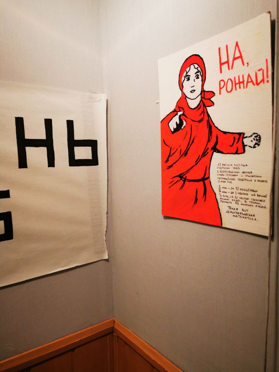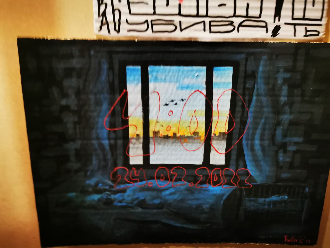 В конце декабря 2022-го в одной из петербургских квартир открылась секретная антивоенная выставка — адрес дают лишь знакомым и друзьям друзей. Авторы хотят выразить протест против вторжения в Украину и поддержать тех, кто разделяет их взгляды. В экспозиции есть картины и стихотворения, а также плакаты, с которыми петербуржцы выступали на митингах и пикетах.