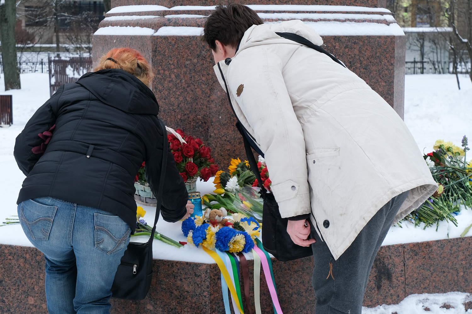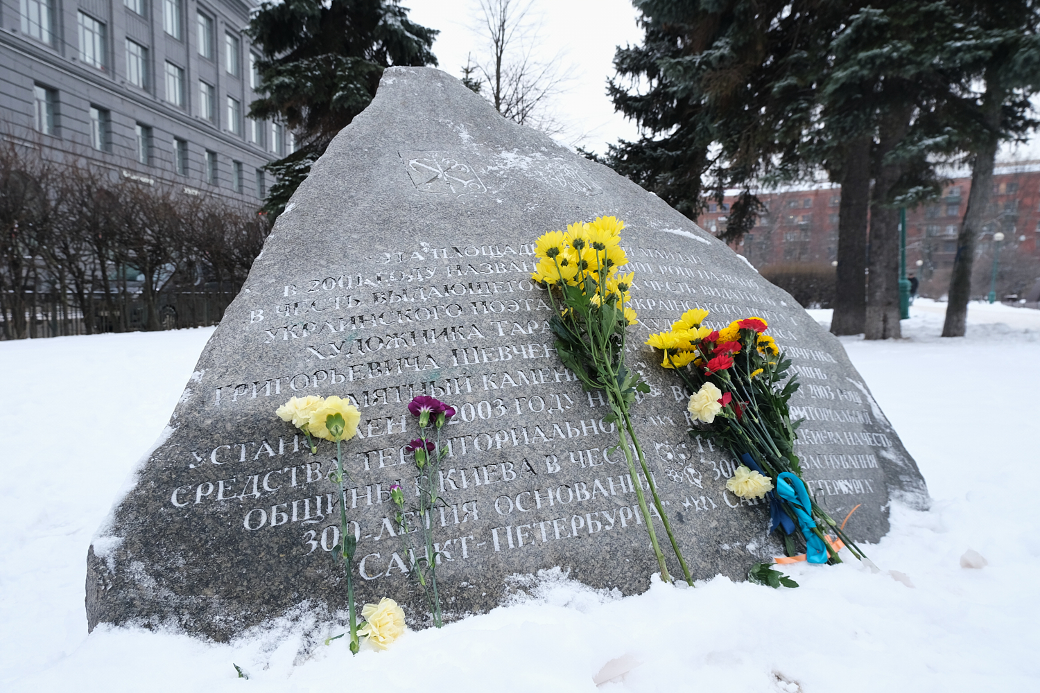 В годовщину войны, 24 февраля, памятник украинскому поэту Тарасу Шевченко в Петроградском районе вновь стал местом, куда петербуржцы приносят цветы в знак несогласия с действиями Кремля. В течение дня десятки горожан подходили к мемориалу, несмотря на дежурящих рядом полицейских. Силовики задержали за возложение цветов как минимум 17 петербуржцев — что им вменяют, неизвестно.
