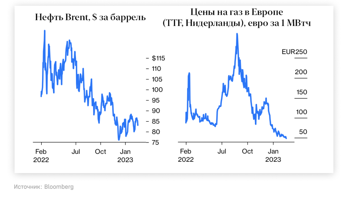 Европа, сильно зависящая от российских энергоресурсов, смогла обеспечить себя газом — во многом за счет закупки СПГ в преддверии зимнего сезона, хотя и по высоким ценам. По расчетам Morgan Stanley (MS), в 2022 году его импорт в Европу удвоился. Также помогли относительно теплая зима и усилия европейцев по снижению потребления (по данным Евростата, в августе–январе этот показатель оказался на 19% ниже среднего за пять лет, превысив установленной Европой же таргет в 15%). Благодаря этому со своего пика в августе цены на газ снизились уже более чем на 80% — до минимумов за 17 месяцев, а запасы в европейских хранилищах близки к историческим максимумам. Правда, аналитики не уверены, что снижение цен продолжится. Среди рисков — рост потребления газа в производстве электроэнергии или в промышленности вследствие снижения цен, а также рост спроса на СПГ в Азии и потенциально более холодный зимний сезон 2023–2024 годов.