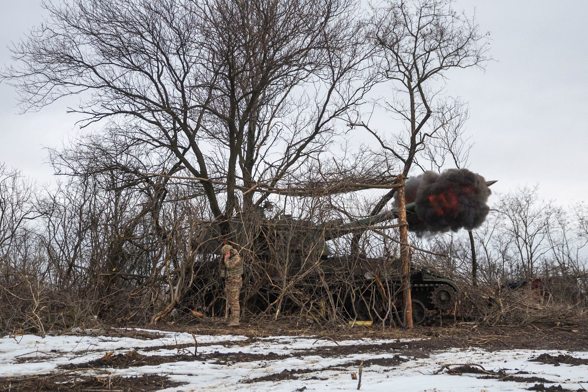 Marko Djurica / Reuters / Scanpix / LETA Военнослужащие 28-й отдельной механизированной бригады ВСУ наносят удар по позициям российских сил под Бахмутом изгаубицы 2С3 «Акация»