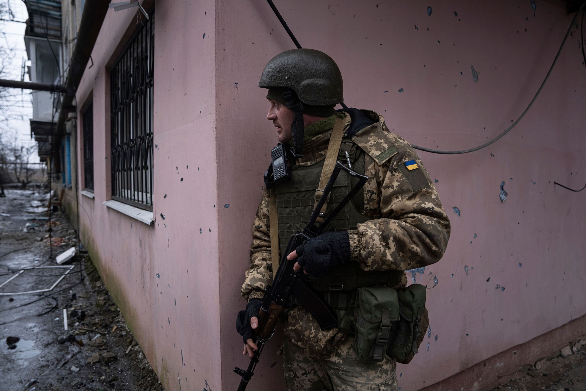 Evgeniy Maloletka / AP / Scanpix / LETA Украинский морпех патрулирует улицы Угледара