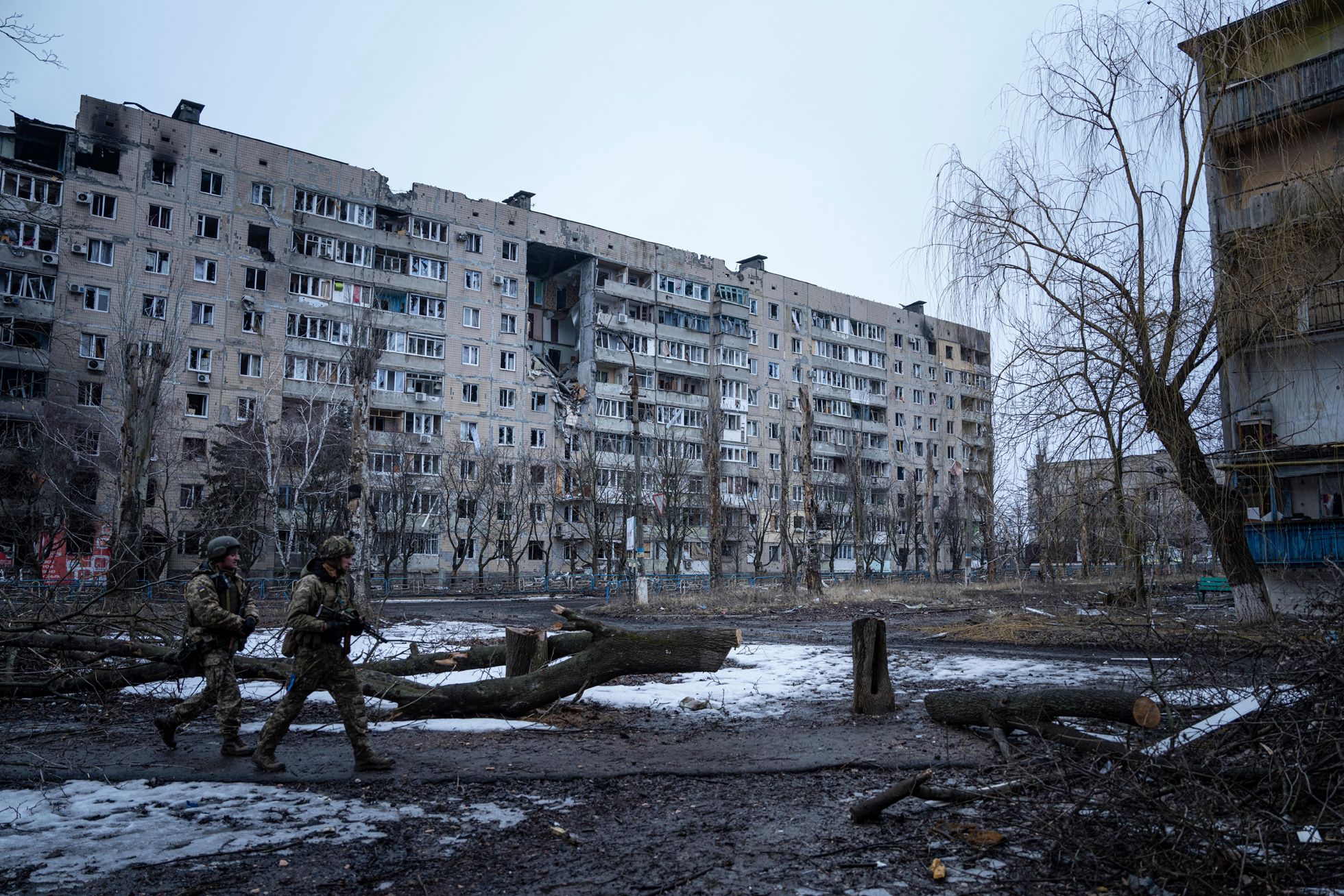 Evgeniy Maloletka / AP / Scanpix / LETA Военнослужащие ВСУ в Угледаре. Городские пейзажи после интенсивных артиллерийских обстрелов с российской стороны напоминают картины, которые за год войны можно было наблюдать в Мариуполе, Бахмуте и других подвергавшихся бомбардировкам городах