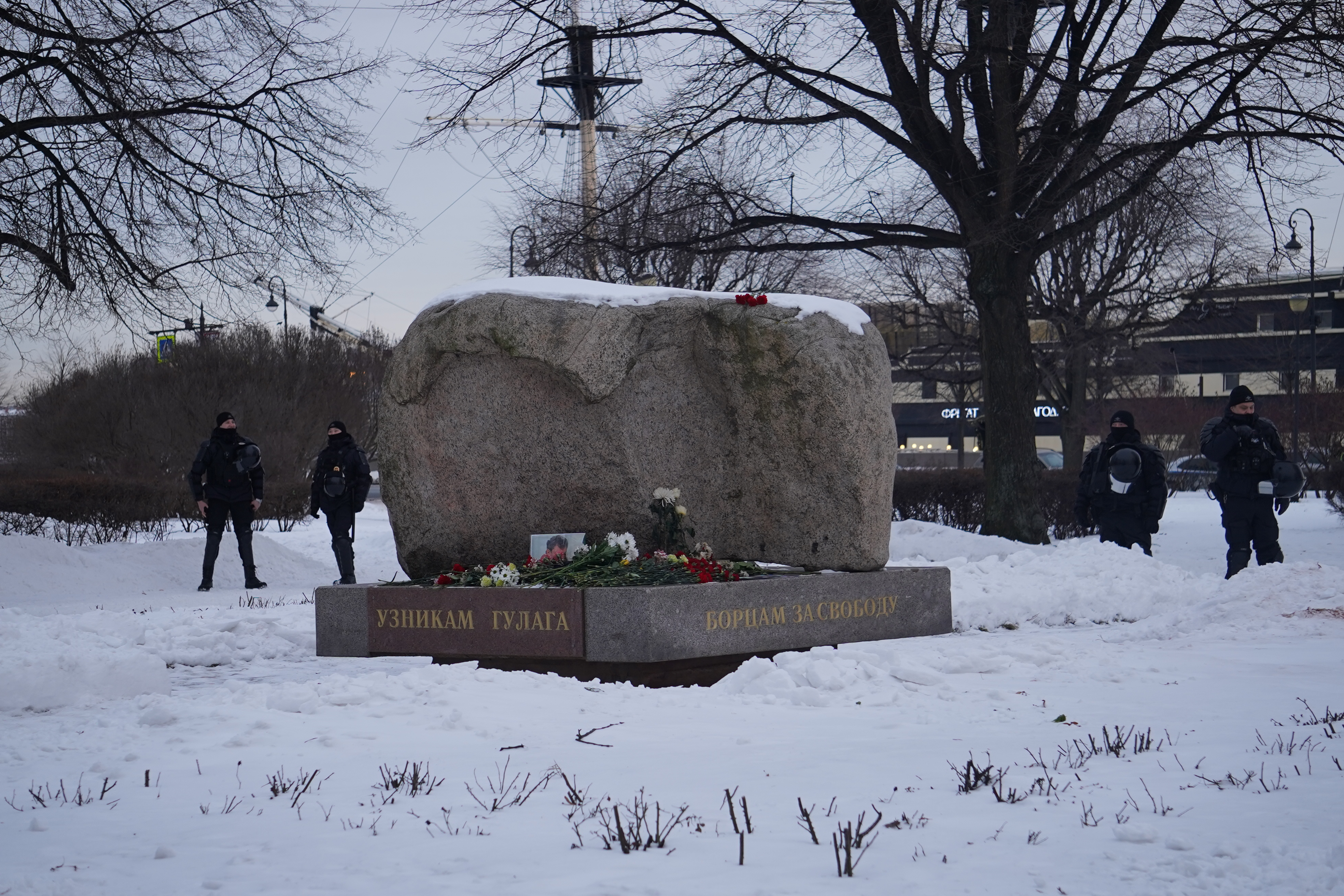 Жители Петербурга провели акцию около Соловецкого камня. По словам корреспондента Север.Реалии еще до начала мероприятия на Троицкой площади собралось около 20 сотрудников ОМОНа и еще несколько десятков полицейских. Один из полицейских фотографировал на телефон жителей города, которые пришли возлагать цветы.
