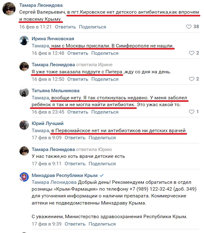 На странице Сергея Аксенова в соцсети «Вконтакте» жители Крыма тоже оставляют немало жалоб на отсутствие необходимых лекарств в аптеках. Из-за этого вынуждены заказывать их через родственников и знакомых в соседней России и ожидать заказа длительное время, пишут они.
